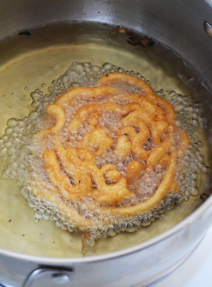 Ever wonder why these are called funnel cakes? It’s because the batter was poured through a funnel into the hot oil to create little funnel “nests”. You can use a small cooking funnel for these, or you can use what I used, an empty pancake syrup bottle.