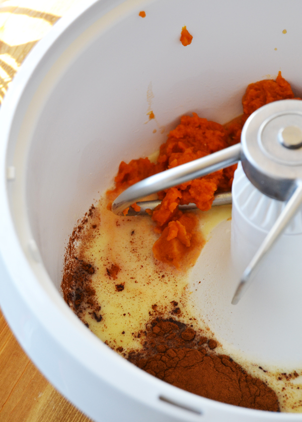 - In a mixer, combine 3 1/2 cups warm water, butter and milk mixture, pumpkin puree, pure maple syrup, vanilla extract, ground cinnamon, yeast, and 3 1/2 cups hard wheat flour.