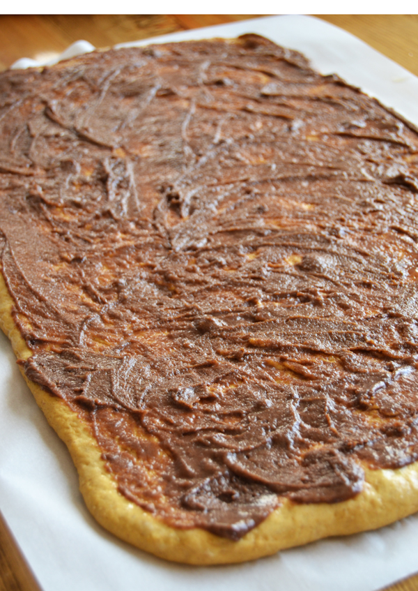 Preheat the oven to 350 degrees. Cover your work surface with parchment paper. The dough should be nice and soft now! Roll out 1 /3 of the dough into a large rectangle, about 1/2-inch thick. Brush with melted butter. Spoon 1/3 of the cinnamon filling on the dough and spread evenly.