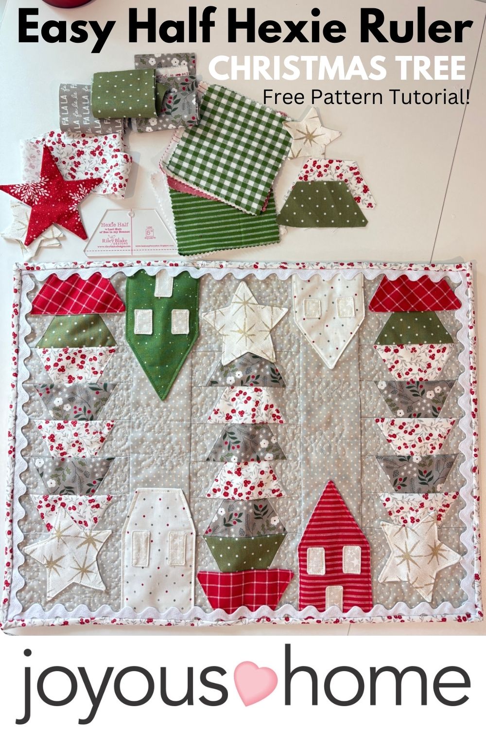 My first thought was to make half hexie trees using the cute half hexie ruler. I then decided to add some house applique and trim. This topper is charm pack and fat-quarter friendly!