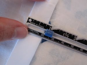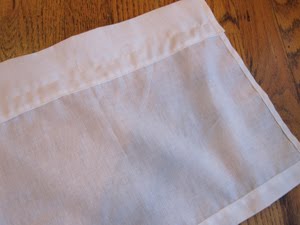 2. Topstitch both sides in cotton thread, very close to the edge.3. Turn and press one long side 1/4″, then press and hem another 2 1/4″. Topstitch in cotton thread. Measure 3/4″ from the stitched hem and sew a straight line to make a casing. This is for the 1/2″ ribbon.5. Turn and press the other long side 1/4″, then hem 3/4″. Top stitch in cotton thread. This is the casing for the 1/4″ ribbon.Here’s what we have now: