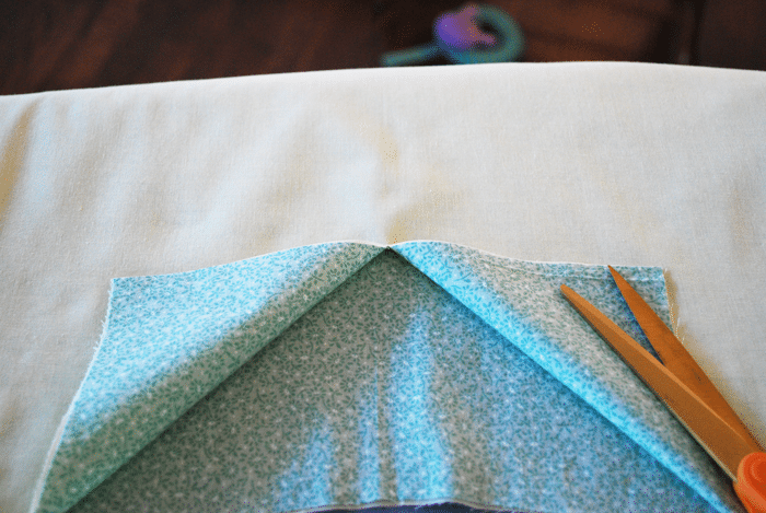 4. Take your pinned placket/skirt to the sewing machine and with matching dress thread, sew a seam allowance that will be able to catch the middle cut and secure it. Make sure your dress is laying FLAT and the cut will almost be even with the raw edge.