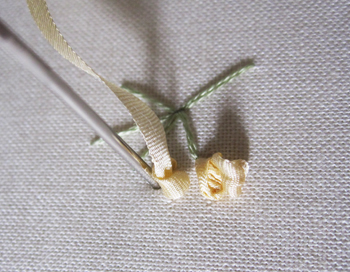 Thread the chenille needle with green silk ribbon. Come up from the back of the fabric, and lay the ribbon flat as shown. Insert the needle in the center of the ribbon, and pull through until the little curl forms on the end. Be very careful when you’re pulling! Pulling too much will pull the curl through, and the cute element of the stitch will be gone.
